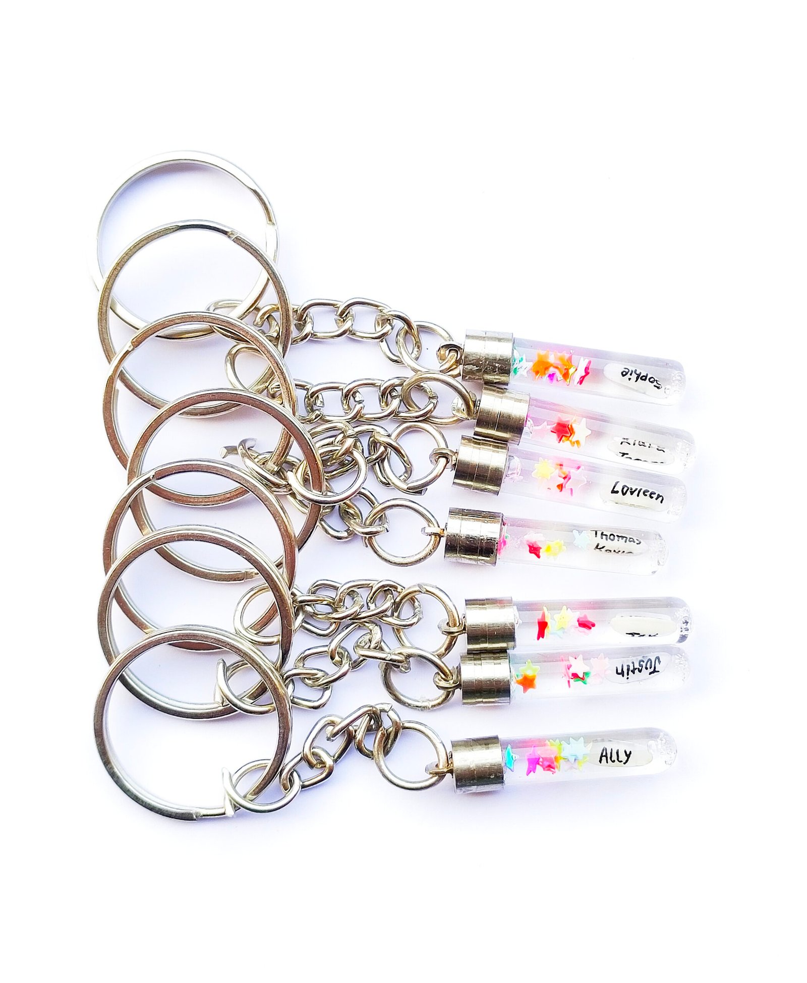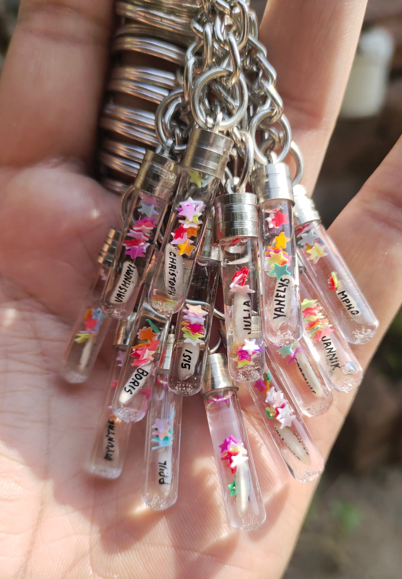 Package contains 2 piece of keychain each of its will contains separate name Your required name will be written on rice grain, Inside of glass tube along with decoration. One keychain can have name up to 4 persons.
